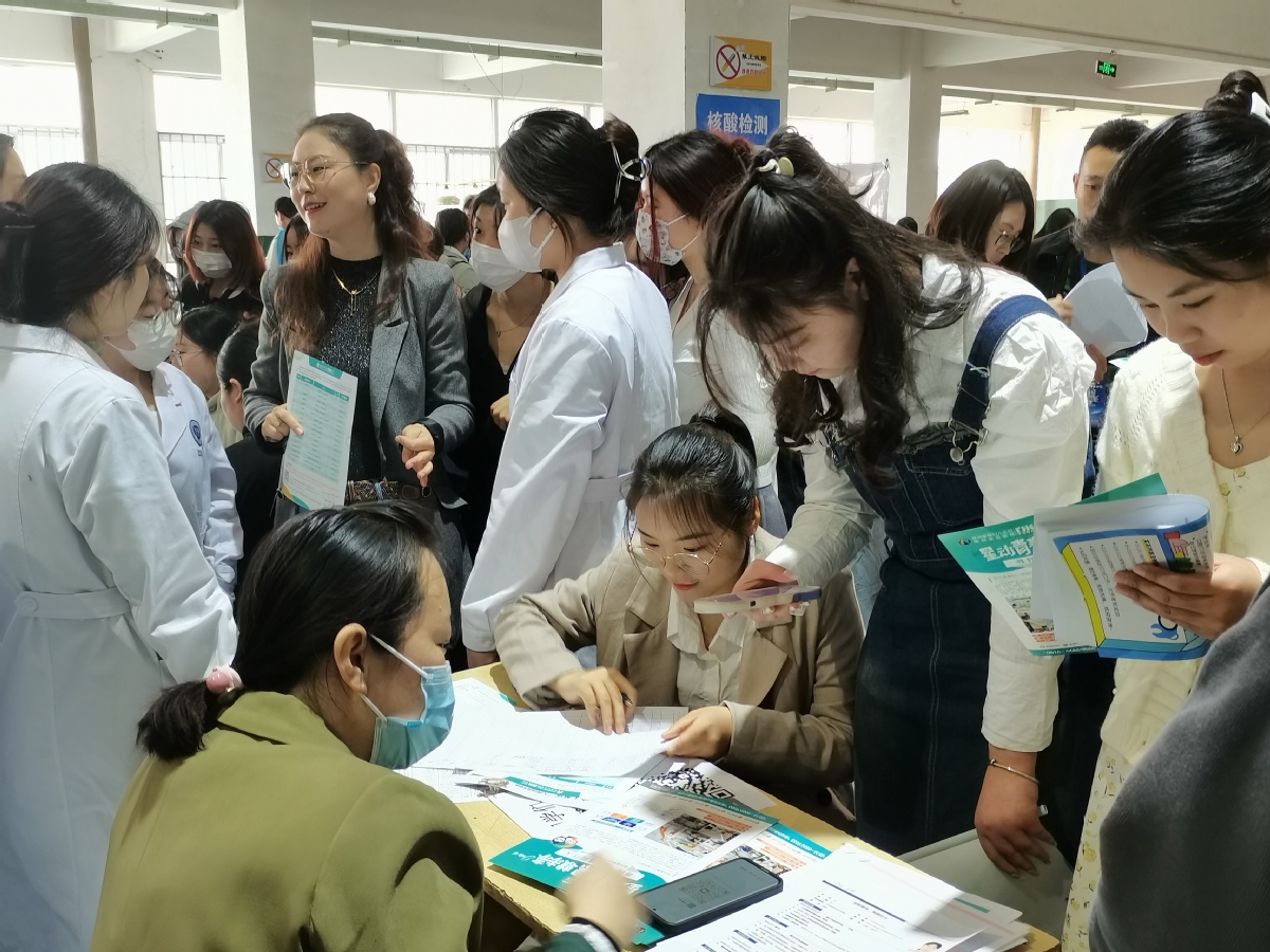 为贯彻落实教育部“春季促就业攻坚行动”,进一步推进2023届医学类毕业生就业工作,3月30日上午,乐鱼平台网页版在文体活动中心举办了“赋能领航,‘医’企共赢”2023届医护类毕业生春季双选会暨“百校千企万岗”2023年徐州大学生春季“送岗直通车”直播推荐岗活动。本次活动由共青团徐州市委员会、乐鱼leyu(中国)主办,医疗与健康学院承办,共青团乐鱼leyu(中国)委员会协助举办。共有近50家省内用人单位前来招聘,提供了近400个就业职位,吸引了乐鱼平台网页版2023届500余名医学专业毕业生到场求职。